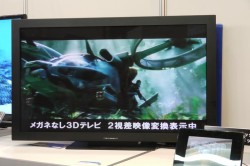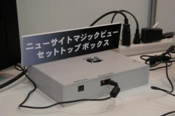 ニューサイトジャパンは、メガネなし3D立体テレビ「Magic-Viewシステム」を出展。これは裸眼立体ディスプレイ「マルチビュー」と、セットトップボックス「マジックビュー」のセット。2視差の立体放送を受信して、8視差の映像に変換。裸眼で立体視できるようにするというもの。発売日や価格などは未定だという。