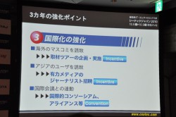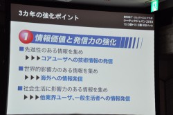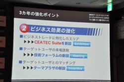 竹市英仁氏続いてCEATEC JAPAN実行委員会を代表し、委員長の竹市英仁氏が開催概要を発表した。竹市氏は、今後の3年間でさらにCEATECを魅力的なイベントへ強化していく考えを示し、そのポイントとして「情報価値と発信力の強化」「ビジネス効果の強化」「国際化の促進」を掲げた。「これらの施策を3年間のうちに着実に実行することで、あらたなビジネス空間へ変革していきたい」と抱負を述べた。