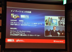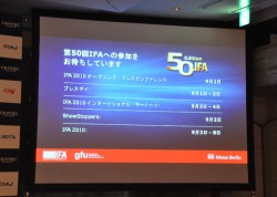 IFAは1924年に「大ドイツ放送展」として誕生後、今年が第50回目の開催となるアニバーサリーイヤーとなる。世界のコンシューマー・エレクトロニクス(CE)業界をリードするイベントとして成長を続け、2006年には開催周期を隔年から毎年に変更。2008年にはCEに加えてホーム・アプライアンス(白物家電)を出展分野に取り込み、昨年は世界経済が低迷する環境下で、会期中受注総額30億ユーロを記録。トレードビジター、一般来場者についても昨年時点で数を伸ばしたほか、トレードビジターやメディアについてはグローバル化も加速し、多くの成果を残した。「IFA2009に出展いただいたメーカー、来場されたトレードビジターの方々からは、IFAに参加できたことで確かな手応えを得たという評価をいただいた」とハイテッカー氏は語り、IFAが業界における重要なビジネスプラットフォームであり、またトレンドセッターとしての地位を不動のものにしたことを強調した。