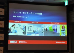 IFAが世界のCE・ホームアプライアンス関係者から信頼を集めるイベントとして地位を確立した背景について、ハイテッカー氏は「共同主催者であるgfuと密に連携を図り、出展各社との堅い信頼で結ばれたパートナーシップを築いてきたことが挙げられる。また小売業界の方々には、IFAをベースにビジネスを成功に導くための流れを明確に打ち出したことや、メディアの方々にはトレンドを見やすく提示できたことなど、様々な“コンセプト”を明確にしてきたことも効果を生んでいる」と述べた。また欧州市場の安定性にも言及し、「北米や中国の経済市場よりも極めて安定しており、人々の消費意欲も旺盛であることが特徴。人々がIFAに寄せる関心は衰えることがなく、例えばテレビの販売台数予測を例にとってみても、北米では2010年から2011年まで3,500万台と横ばいであるのに対して、欧州は2010年で4,800万台、来年は5,400万台になると見込まれている。欧州は経済成長が安定していることから、ビジネスがつくりやすい土壌であると言える」と説明を加えた。