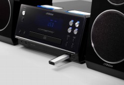 ツインドックはiPod/iPhoneの自動充電に対応。主要操作は付属のリモコンから行える。また本体フロントにはUSB端子を装備。MP3/WMAフォーマットの再生のほか、音楽CDからUSBメモリーへのMP3録音(128kbps)も行える。CDプレーヤー部では音楽CD、CD-R、CD-RWの再生が可能だ。