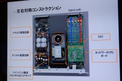 内部構成はアナログ電源回路とデジタル電源回路、DACとネットワークCPUボードなどを左右対称に配置するレイアウトを採用している。CD-S2000にも搭載したバーブラウン製DAC「PCM1792A」を左右独立で搭載し、差動方式で駆動。DAC〜出力間は全段完全バランス伝送としている。またアナログ回路用にトロイダルコラトランス、デジタル回路用にはEIコアトランスを使用し、デジタルとアナログを独立させている。
