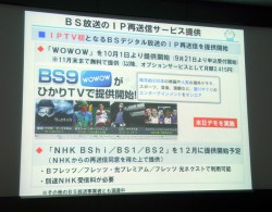 まずは映像コンテンツをさらに充実させることを宣言。BS放送のIP再送信サービスにも、より積極的に取り組む考えを示した。10月1日からはBSデジタル放送「WOWOW」のIP再送信を開始する(関連ニュース)。同サービスは9月21日から申し込み受け付けを開始し、11月末まで無料で提供する。以降はオプションサービスとして月額2,415円で運営される。さらに12月からは「NHK BShi/BS1/BS2」を提供開始する予定であるという。板東氏は「NHKからの再送信同意が得られれば予定のスケジュール通りに開始できる。その他のBS放送事業者とも、現在サービスの提供について協議中だ。今年末から来春をめどに実現できるよう準備を進めている」と説明した。