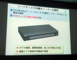 また2010年5月からはHDD内蔵チューナー「IS1050」(関連ニュース)の販売が開始されている。本体には500GBのHDDと、2基のひかりTV対応チューナーを内蔵し、同時間帯の2番組同時録画も行える。また、録画中の番組の追いかけ再生が行えるほか、ドラマなど連続番組の毎回自動録画、番組開始時間の変更時対応などの機能も実現している。同社では年内に本機のレンタル提供のスタートもサービスインを検討しているという。具体的な導入時期やレンタルサービスの実施料金については現在調整が行われている。