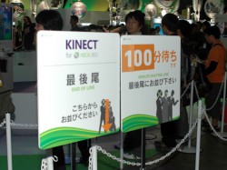 マイクロソフトのXBox 306ブースでの注目は、やはりキネクトだろう。通路からも一際目に付く高いステージ上でコンパニオンがデモを行っているほか、来場者も実際にキネクトの各種ゲームを体験できるようになっている。キネクトのデモへの関心はやはり高いようで、ビジネスデーの本日でも100分待ちという長蛇の列ができていた。