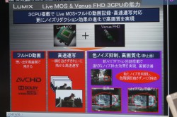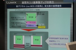 LIVE MOSセンサーは、構成はGH1と同じだが、画素を新構造とすることで配線を削減。高画素化しつつ、GH1と同等の開口率を実現した。また、高速読み出しに適した新たな画素構造を採用し、専用ADCも搭載。さらにデジタル回路の高速動作に必要な高性能トランジスタと配線プロセスを採用した。加えて回路の徹底的な低ノイズ化を図ったことにより、GH1と比べて約3dB以上のノイズ改善と、約2倍の高感度化を実現したという。