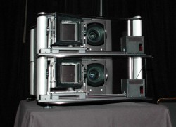 新製品のデモ後、別室に移り、3D対応LEDプロジェクターを使ったデモが行われた。RUNCOがデモに使ったのは偏光方式。オリジナルのモジュール内にプロジェクターをスタックしてデモを行った。