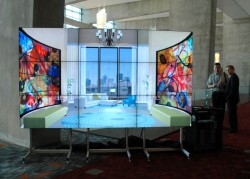 出色のソリューションは、巨大な映像の壁が目を引くWINDOW WALL。薄型の液晶パネルを自由に組み合わせることが可能で、環境映像を流してインテリア的に使ったり、スポーツや映画を大画面で楽しめるほか、テレビ会議にも使用できる。プロセッサー部はパネルと分離しており、放熱やノイズの問題を解消したという。