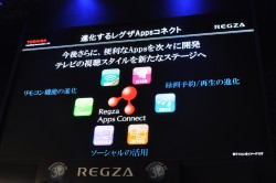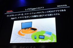 「Regza Apps Connect」は、同社の液晶テレビやビデオレコーダーの録画機能、ネットワーク機能を活かしながら、ウェブ上のクラウドサーバーを基地に、スマートフォンやタブレットPC対応の「Apps」(アプリケーションソフト)を活用した機能を利用できるサービス。同社社長の大角氏は、新しいサービスの立ち上げと共に「東芝クラウドテレビ構想」のコンセプトを提唱し、今後テレビ/レコーダー製品向けの新たなクラウドベースのサービスを継続的に開発・提供していくことを宣言した。