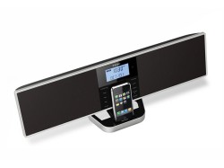 リビングやプライベート空間にマッチするようスタイリッシュな薄型デザインを採用したモデル。iPod/iPhoneドックのほか、ステレオミニ端子とRCA端子も備えている。