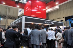 (株)NTTドコモのブースには、本日発表されたサムスン製スマートフォン「GALAXY S」と「GALAXY Tab」の実機をタッチアップできるコーナーが設けられており、その周囲は黒山の人だかりができていた。