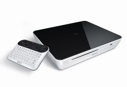 リモコンは両手で持つ独特の形状で、QWERTYキーパッドを備えているほか、光学マウス機能も統合したRFリモコンとなる。