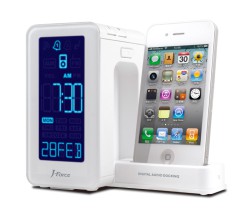 視認性が高い大型の液晶ディスプレイを搭載し、日時を確認しやすくした。また、iPhone/iPodの時刻設定に自動で同期する自動時刻設定機能も備えている。アラーム音はiPod/iPhone、FMラジオ、電子音が選択可能だ。