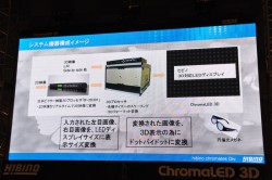 ChromaLED 3Dシリーズの特徴については、ヒビノより事業企画部 徳島R&D所長の岡野啓輔氏が説明を行った。販売が開始される6mm画素ピッチの「ChromaLED 3D6」は、先述の通りドットバイドット表示による高精細な3D表示と、円偏光方式への対応による安定した3D効果と広視野角を実現している。またビクターの3D技術を応用した高速画像処理により、奥行き感、色彩再現の豊かなフルカラー映像表示を可能にしたほか、高輝度なLEDならではの明るい環境下での高い視認性が特徴となる。岡野氏は「ビクターの2D-3D変換システムを組み合わせることで、ユーザーサイドでは手軽に2D/3D切り替えができる点もメリットとしてアピールしたい」と語った。