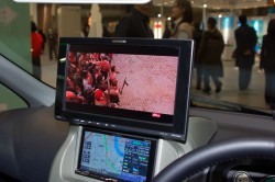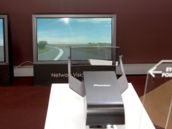そのほか、AVとは直接的には関係しないものの独特だったのが、スマートフォン連携型の次世代車載ディスプレイ「Network Vision Head Up Display(HUD)」の参考展示。ドラゴンボールの「スカウター」のように実際の風景に情報などの映像を重ねて見せるというもので、RGBレーザーを光源として採用することで、フロントガラス前方の空間に鮮明な情報コンテンツを浮かせて表示させるという。