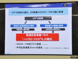 3D再生時の画質向上にもつながる技術の一つとして、光配向プロセス技術を用いたUV²A技術を進化させた「ハイスピードUV²A」が、本シリーズから初めて搭載された。従来のUV²A技術をベースに、低粘性の新液晶素材を採用することで液晶素材の動きを改善している。また液晶セル構造も新しく厚みを薄型化し、応答の効率性を向上させている。これらの進化を遂げたことにより、同社のLV3ラインとの比較でクロストークを約70%削減したほか、平均応答速度3m secという高速応答を可能にし、3D/2Dともに画質向上を果たした。