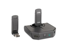 本製品はPCに接続するUSBアダプターと、ディスプレイに接続するフルHDアダプターから構成。両者間をウルトラワイドバンド(UWB)方式で高速通信し、フルHD動画や音声などの伝送を行う。通信距離は最大10m。