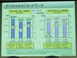 テレビ事業が含まれるデジタルAVCネットワーク分野の売上高は、前年同期比0.3%増となる2兆5,854億円。携帯電話やデジタルカメラなどの売上は減少したものの、BDレコーダーや薄型テレビの売上が伸び増収となった。そして営業利益は、固定費削減や合理化努力等により円高の影響等をカバーし、前年同期比191%の1,012億円を計上した。