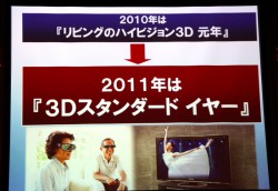 さらに吉清氏は「3Dコンテンツが充実し始めているし、3Dカメラなどプライベートコンテンツを撮影できる機器も増えてきた」と、3Dを楽しむ環境が整ってきたことも指摘。「我々は2010年をリビングのハイビジョン3D元年と位置づけていたが、2011年は『3Dスタンダードイヤー』にしていきたい」と述べた。