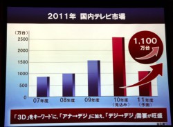 こういった背景から、吉清氏は「2011年度は少なくとも1,100万台、できれば1,300万台くらいの市場を期待している」と語り、「これを牽引するのが3Dテレビだ」と力強く宣言した。