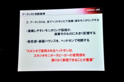 記者発表会にはアーティストの石塚まみさんがゲストに招かれ、ボーカルレコーディングの現場を再現しながら、ヘッドホンのパフォーマンスを体験できる機会も設けられた。ビクタースタジオのエンジニアグループ長である秋元秀之氏の解説を交えながら、レコーディングブースに用意されたダイナミック/リボン/コンデンサーの3種類のマイクによる音質の違いが紹介されるとともに、コンデンサー型マイクを使った石塚さんのボーカル録音を一堂で体験し、スタジオのリファレンスモニタースピーカーとHA-MX10とで聴き比べることができた。