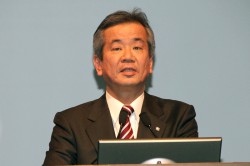 まず登壇したキヤノンマーケティングジャパン(株)川崎正巳代表取締役社長は、同社のカメラ事業が好調に推移していることをアピール。「昨年キヤノンはコンパクトデジカメ、デジタル一眼レフカメラでシェアNo.1、ムービーも含めたデジタルカメラ全体でもNo.1シェアを獲得。IXY 30S/50SやEOS Kissシリーズ2機種、EOS 60D、交換レンズなど、各カテゴリの製品で非常にご好評を頂いている。7年連続No.1を保持してきた今では、デジタルカメラと言えばキヤノン、というイメージは不動のものになった」と力強く発言した川崎氏は、現在のカメラ市場を以下のように分析した。