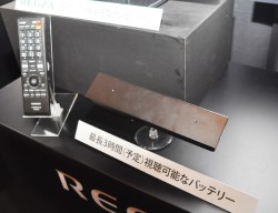 参考展示されたプロトタイプは、外装については最終段階のものではないが、画面解像度は1,366×768画素。ベゼルの左上コーナーに“REGZA”のブランドロゴが配置されている。付属のリモコンには「ピークシフト」ボタンが設けられ、ボタンを押すと駆動電源がACから内蔵バッテリーに切り替わり、バッテリーで最長3時間のテレビ視聴が可能になる予定という。バッテリーはリチウムイオン充電池が採用されており、5時間でフル充電が可能。