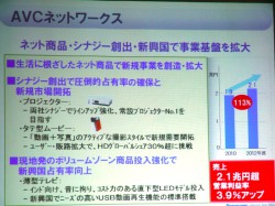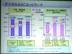 デジタルAVCネットワーク事業については、売上高は3兆3,040億円で、BDレコーダーなどは好調に推移したものの、携帯電話やデジカメなどの売上げが減少し、前年比97%の減収となった。営業利益は1,149億円で、前年より276億円の増益となった。売上げの減少を固定費削減や合理化努力などによってカバーした効果が現れた。