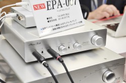 USB-DAC「HD-7A」の基本機能を踏襲しつつ、USBからの192kHz/24bit入力に対応したDAコンバーター「HD-7A192」と、DDコンバーター「HD-7D192」にも注目が集まった。自社開発した96kデータフローエンジンに加え、USB Audio Class2.0対応のアシンクロナスモード対応エンジンを新たに搭載。XMOS社のコントローラーに独自のプログラミングを施し、HD-7A192内で生成したクロックをスレーブモードで動作させている。またアナログ部の電源を強化。左右独立のアナログ用トランスを追加し、更なる音質の向上を図っている。発売は今年の6月を予定。各モデルは、全段ディスクリート構成のデュアルモノヘッドホンアンプ「EPA-007」との組み合わせでヘッドホン試聴を行うことができた。