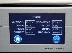 タッチパネル操作を採用し、液晶画面で入出力電圧・消費電力・歪率の表示が可能。オシロスコープ機能を内蔵し、入力と出力の波形表示も行える。