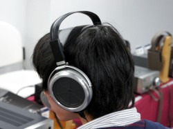 同製品は、新開発サウンドユニットを搭載したコンデンサー型ヘッドホンのフラグシップモデル。興味深そうに製品を試す来場者の姿が見られた。