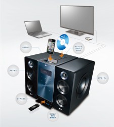 Blu-ray 3DやDVD、CD、USBメモリ(MP3/WMA/AAC)、iPodなどさまざまなメディアを再生可能なオールインワンシステム。天面にはBlu-rayなどのディスクをセットするスロットインドライブと、iPodやiPhoneドックを備える。また前面下部にはUSB端子やヘッドホン端子、マイク端子などを備える。