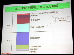 なお同社は2011年度に特別損失として、亀山第2工場の液晶事業構造改革費用に150億円を、また震災に関連して工場の操業を止めていた損失として270億円を計上する予定。この影響で、純利益は前年比30.9%の60億円にとどまると予想している。