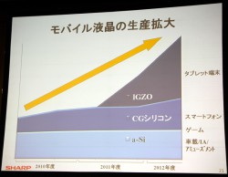 IGZO液晶については、亀山第2工場の生産を、今年10月以降からIGZOへ徐々に転換していく計画を発表。「すでにサンプル出荷を配っているが、2012年に向けて相当に大きなデザイン、引き合いを頂いている」と、タブレット機器向けに、IGZO液晶の大口の交渉が進んでいることを示唆した。