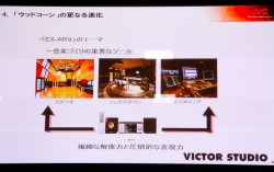 プレゼンには、チューニングに参加したビクタースタジオ長の高田英男氏も登壇。高田氏はEX-AR9について「エンジニアが普段使っているニアフィールドスピーカーに匹敵するくらい音色の再現力が高い。楽器の音色感を素直に表現する。スタジオの現場では、妙な音が入っていた場合、下手にキレイにするのではなく、そのまま表現できる能力がすごく大事だが、EX-AR9のスピーカーはその条件を満たしている」と、エンジニアの立場からもその実力に自信を見せた。