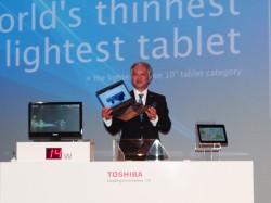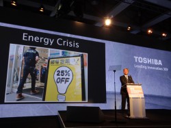 大角氏は3月の大震災後に発生した「エネルギー危機」を受けて、日本の国民ひとりひとりが「節電」のために努力してきたことを紹介し、東芝として、人々の努力をサポートするために行ってきた取り組みを挙げた。大角氏は「東芝が考える“未来のデバイスのあるべき姿”とは、ハイクオリティなエンタテインメントとエネルギーマネージメントの性能を高次で両立させた製品である」とし、プレスカンファレンスで発表した新しいAndroidタブレットやノートPCなどが、エンターテインメントのパフォーマンスと省エネ性能を両立させた製品の代表例として紹介された。