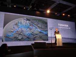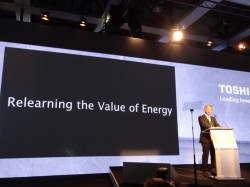 日本は復興への取り組みを通じて、将来の世代にも豊かさを引き継げる「持続可能な社会」を獲得できると大角氏は述べ、この持続可能な社会のビジョンを「スマート・コミュニティ」として、東芝のテーマとして推進していくと述べた。そして自然と人間が共生していくために、ソーラー/地熱/風力といった、再生可能エネルギーを積極活用していくべきであるとも強調した。大角氏は「再生可能エネルギーを既存の送電網に組み込むことは大きなチャレンジだが、そもそも日本の送電網の立ち上げに深く関わってきた企業は東芝だ。そして、東芝の送電網は世界で最も効率的なグリッドであることに注目して欲しい」とアピールした。また東芝が長年かけて作り上げてきた電力技術をベースに、新たなエネルギー・マネージメント・ソリューションを世界に向けて提供していく方針を述べた。