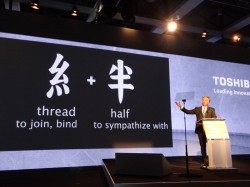 「東芝は日本国内にとどまらず、ヨーロッパへ、そして世界に向けてスマート・コミュニティ実現のためのソリューションを提供していく」と述べ、デジタルデバイスのリーディングカンパニーとしてだけでなく、人と人、コミュニティとの強い「絆」の確立に貢献していくと、同社の企業ビジョンを宣言。「復興へ力強く歩み始めた日本をサポートしながら、東芝はこれからも全力でグローバルな社会貢献に邁進して行きたい」とスピーチを締めくくった。