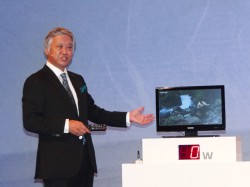 また日本国内向けにも6月に発表が行われた“ピークシフト機能”を搭載した19V型の“REGZA”(関連ニュース)も壇上で紹介し、AC電源に加えて内蔵バッテリーで最長3時間のテレビ視聴が行える機能をデモ。電力のピークシフトに貢献できるテレビとして、導入国で高い評価を獲得していることを強調した。また、テレビやBD製品のために開発した、待機電力0Wを実現する「ecoチップ」についても、日本国内で年度内に搭載商品を発売することも紹介した。