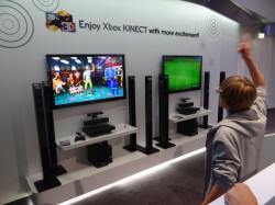 プロジェクターのコーナーには、昨年のIFAでも披露された3D対応のSXRDプロジェクター「CF3D」での上映による3Dシアターを設置。120Hz駆動の「TruMotion」や、2D/3D変換機能を搭載する。本体フロント側に小型カメラユニットを内蔵し、映像に合わせて明るさを自動調整する機能も備える。