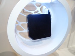 プロジェクターは本機の他にコンパクトなDLPプロジェクター「HW300Y」も展示されている。本体にWiFi機能を内蔵しており、ワイヤレスでホームネットワークにつないで、DLNA対応の表示デバイスとして使うことができる。解像度は1M280×800(WXGA)。スピーカーも内蔵する。
