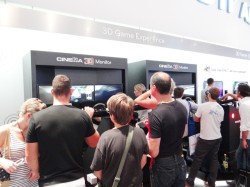 LGの3Dテレビで楽しむ3Dゲーム体験コーナーは常時黒山の人だかりができている。ユニークな展示は、フィリップスのブースにも同じタイプの製品が出展されていた(関連ニュース)、3Dテレビのサイドバイサイド表示技術を応用した「Dual Play」表示によるゲームエンターテインメントの体験コーナー。元々は2画面スプリット表示で楽しむゲームを、3Dテレビで左用・右目用の映像に振り分け、同時に全画面表示で楽しめるという技術だ。LGではパッシブタイプの3D対応テレビ全機種にこの機能を採用しており、左目用・右目用だけの映像を表示する専用のパッシブ3Dメガネをかけて楽しめる。