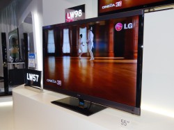 ブースを進んでいくと、液晶テレビの新製品にはフラグシップモデルの「LW980S」シリーズが展示されている。シリーズには55V型と47V型が揃い、極薄LEDバックライトモジュールに遮光パターンフィルムと拡散板を組み合わせた「NANO FULL HD」技術を採用し、高画質と薄型化を両立させている。3D映像の表示はパッシブ方式を採用。高精度な2D/3D変換技術も搭載した。欧州の著名なテスト機関である「TUV」「Intertek」が“フリッカー・フリー”の認証を与えたという、高精細な3D表示を特徴としている。パネルは倍速駆動技術「TrueMotion」にも対応。また対応するLGのテレビ、スマートフォン、その他のデジタル機器のユーザー同士でコンテンツをシェアできる「Smart Share」機能にも対応する。