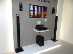ホームシアターシステムは“CINEMA 3D Sound”シリーズより、9.1ch再生に対応したパッケージ「HX906TX」が新製品としてハイライトされていた。4本のタワー型のサテライトスピーカーは、上部に360度無指向性タイプのユニットが搭載されており、「LGのCINEMA 3Dテレビとの組み合わせで、サウンドも3Dで楽しめるシアター」として大規模な特設視聴ルームを設けて紹介されていた。センターユニットにはBlu-ray 3D再生対応のBDドライブや、LGの「Smart TV」に対応するネットワーク機能も搭載されている。