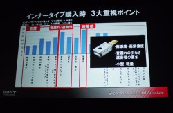 カナル型イヤホンの購入者が、購入時に重視するポイントについても調査が行われており、結果「音質」「音漏れ/遮音性能」「装着感」が“3大ポイント”として浮かび上がったと磯村氏は語る。これら調査の結果をベースに「インナーイヤータイプのユーザーニーズにぴたりと合うのが、今回ソニーが自信を持って発表するBA型のモデル」であると磯村氏は胸を張る。