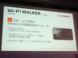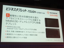 さらに「ユーザーのマルチデバイスの使い勝手のニーズに応えたい」という思いから作った3G/WiMAX対応のモバイルWi-Fiルーター“Wi-Fi WALKER”「DATA08W」を発表したことや、“ビジネスタブレット-TOUGH-”「ETBW11AA」の紹介時には、「タブレットのメインユースは法人になっていくだろう」という見解も述べた。