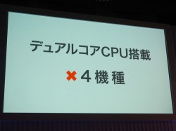 田中氏は、フィーチャーフォン利用者の平均ネット接続時間は約60分だが、それがスマホ利用者では約170分に拡大しているというMM総研の調査結果を挙げ、「フィーチャーフォンではネット閲覧にストレスがあるのではないか。ネットをよりよく使いたいという思いがユーザーにはあるのだと思う」と説明。今回発表機種のうち、4モデルにデュアルコアCPUを搭載したことを紹介し、「IS03が出た1年前と比べると、圧倒的な速さ」と、“気持ちよく動作する”ことを強調した。