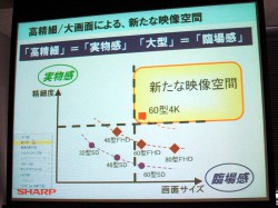 さらに「テレビに求められているのは『臨場感』と『実物感』」とし、「色々な研究の結果、2m〜3m程度の位置からの通常の視聴では60V型を超えたあたりから臨場感が出てくる」と言葉を続け、画面サイズとの関係性も説明。そして実物感とは精細度のことでもあるとし、臨場感と実物感の関係性において「今までのテレビと違う軸のテレビが出てくる可能性が出てきた」と4Kテレビの状況を説明する。