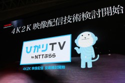 また、「ひかりTV」による4K2K映像配信が検討中であることも明らかにされた。これはJVCの4K2Kカメラで撮影した映像を、ひかりTVのCDN(Contents Delivery Network)回線で配信するというもの。「4K2K映像を配信する際は30Mbps程度のビットレートになる。現在ひかりTVで地上デジタル放送を配信している際のビットレートが15Mbpsなので、1家庭で2チャンネルまで見られる環境(Wチューナー搭載機保有など)を持っている方であれば、現状の環境でも十分配信は可能」(ひかりTV説明員)とのこと。