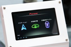 駐車するだけで充電ケーブルやプラグを使わずに充電できる「非接触充電システム」を参考出品している。汚れたケーブルを触らずすんだり、夜遅く帰って暗い車庫でケーブルを探さなくて良いのがメリットだ。約7〜8時間で満充電になるとのこと。ケーブル接続充電と比べて80%ほどの効率実現を目指しているという。昨年のCEATECでも参考出展されていたが(関連ニュース)、大幅に小型化したことに加え、スマートフォンやタブレットとの連携機能を追加したのが進化ポイント。充電状況(パーセンテージや充電時間)、駐車位置表示などの情報を確認することができる。